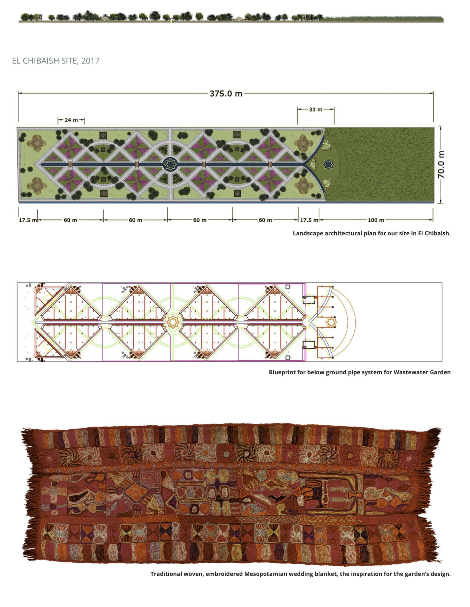 The Wastewater Garden® features locally significant design details and will engage with local craftspeople, using local materials, and ancient crafts e.g. reed structures, earthen (adobe) brick, ancient cylinder seal patterns for ceramic tiles, and a floral design layout that is inspired by Mesopotamian embroidered wedding blanket patterns. Treated water will be reused to irrigate beautiful shrubs and fruit trees, creating a beautiful public garden/park. This first demonstration Wastewater Garden will create a green space that can be scaled up and down throughout Iraq and the region, where adequate sustainable sewage control is lacking. It will be a hub for a community-centric culture to continue to manifest, allowing for local trade and cottage industries to bolster the regional economy. In addition, this nature-based solution will help to mitigate climate change by providing additional green areas for carbon sequestration.